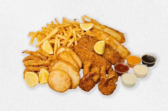 Basa, calamari, prawns, scallops, chips & sauces. Everything you love in one massive box!